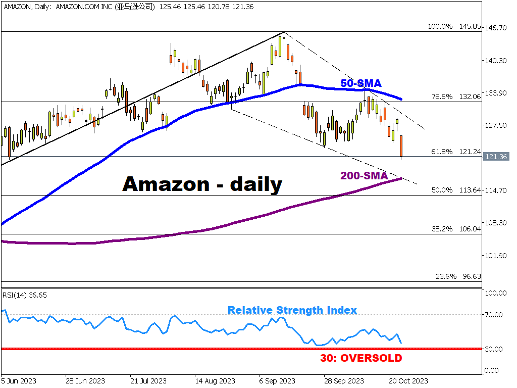 After the 5.6% drop yesterday (Wednesday, October 25th), its largest single-day decline since February, Amazon's share price now rests on the 61.8% Fibonacci retracement level from its January-September climb.