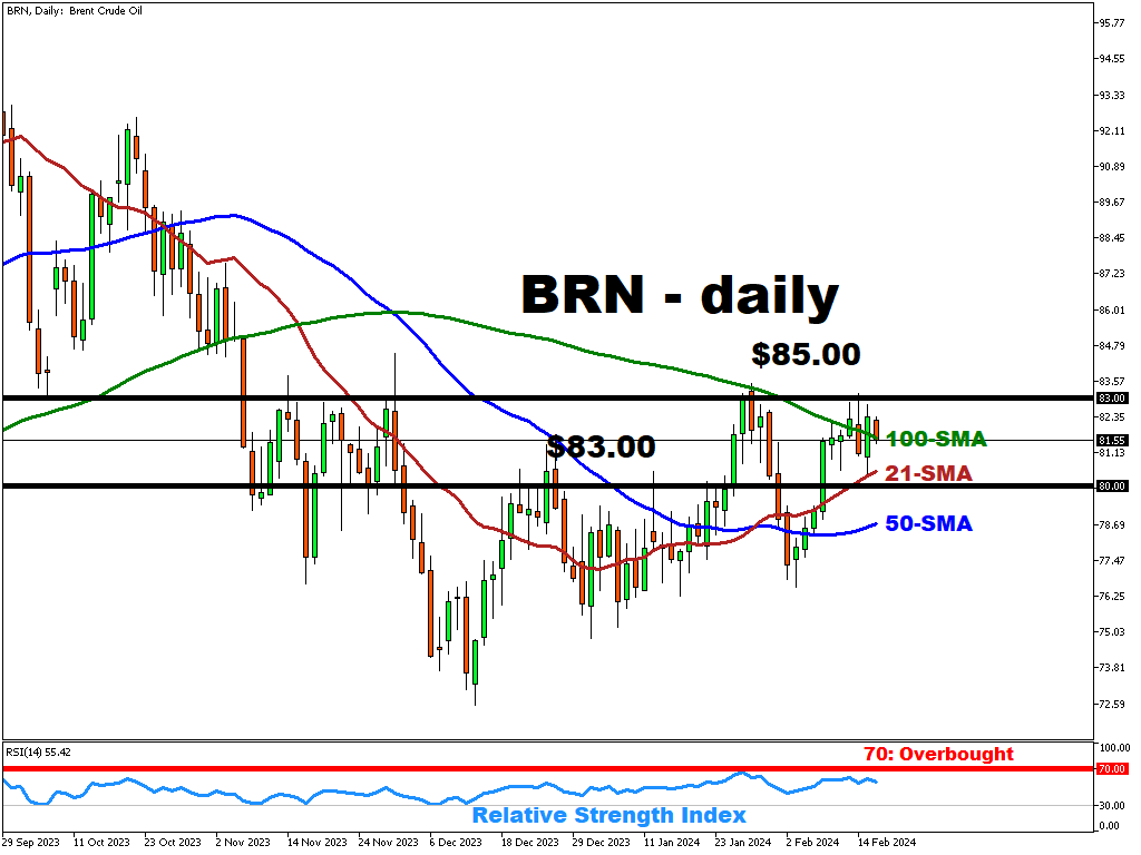 • The Relative Strength Index’s (RSI) position at 55.42 underscores the current state of uncertainty in the market, leaving the possibility for the BRN to move in either direction depending on the upcoming macro-economic data