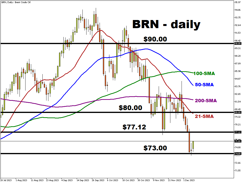 BRN is trying to rebound away from $74/bbl after a ~10.15% drop in price (30.11.2023-06.12.2023) amid market skepticism on whether the OPEC+ production cuts will be fully implemented.