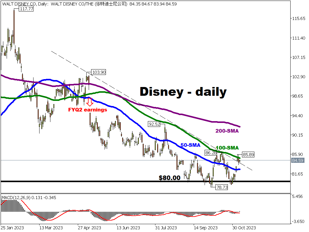 - 10 August 2023: Disney jumped by 4.88% after better-than-expected FYQ3 results, but have since struggled to emulate that $92.52 post-earnings peak.