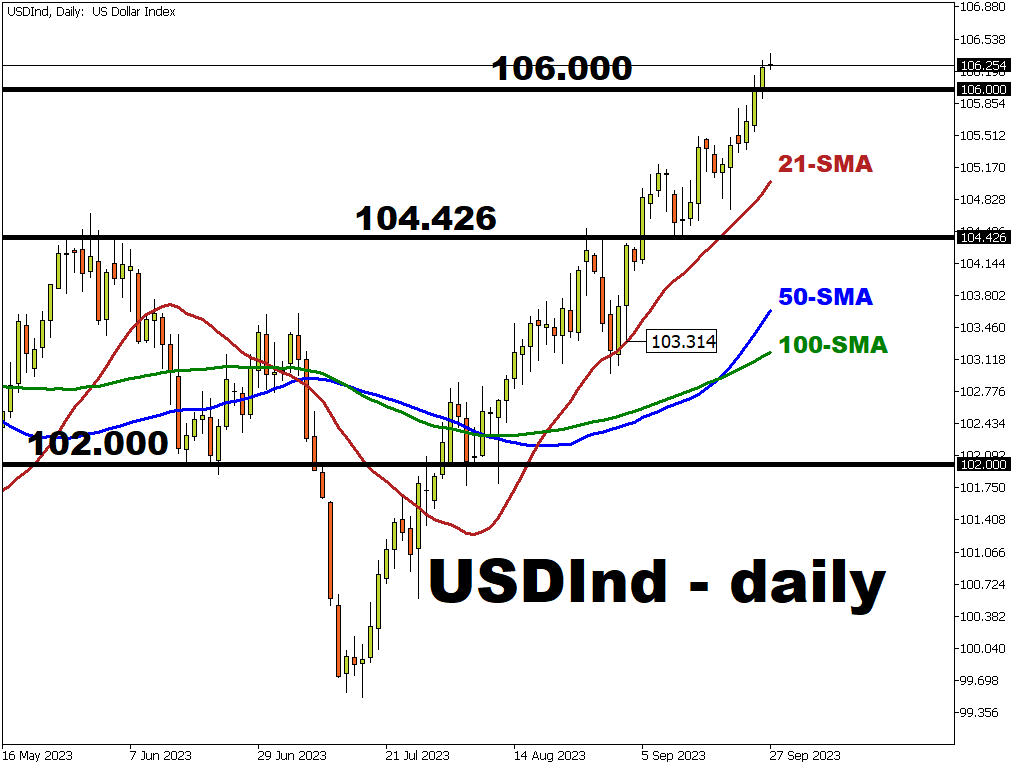 USDInd, which measures the US dollar’s performance against a basket of major currencies such as JPY, EUR, and GBP, has now soared to its highest levels since November 2022.