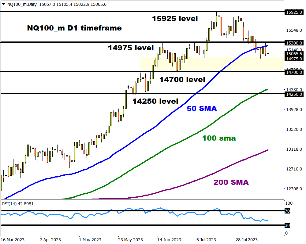 After breaking below the 50-day SMA, the Nasdaq 100 has traded within a narrow range with support at 14975 and resistance at 15300. A breakout below the current support could open a path toward 14250, just below the 100-day SMA. Should prices push back above 15300, bulls may eye 15925.