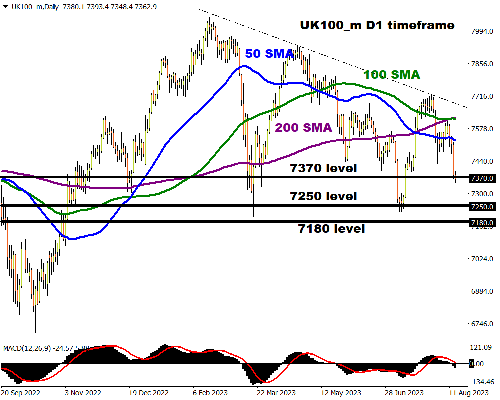 UK100 bears remain in the driving seat on the daily charts with prices approaching key support at 7250. A breakdown below this level may encourage a decline towards 7180 and potentially lower. Should 7250 prove to be reliable support, prices may rebound back towards the 50-day SMA.