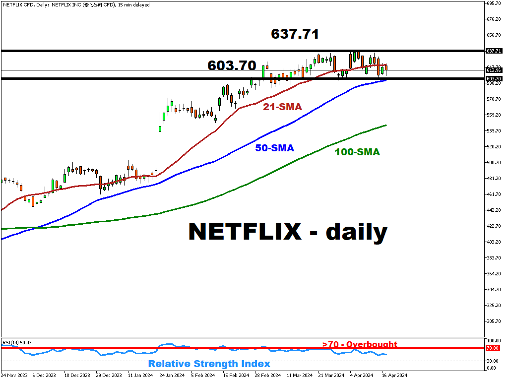 Netflix’ stock has been consolidating in-between the ~2 year high (~637.71) and 603.70 support level.
