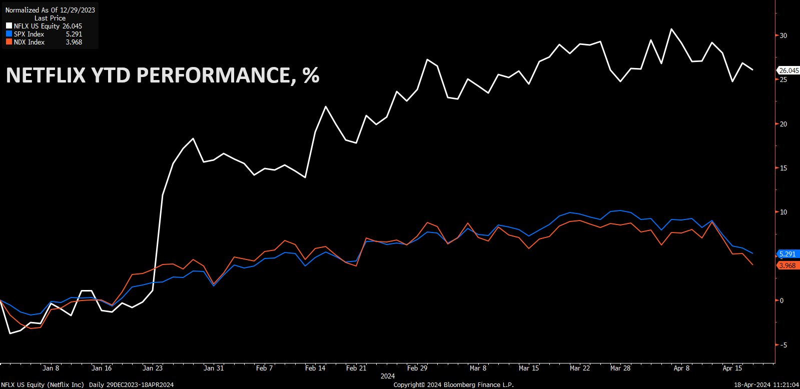 Netflix’ stock posted 26% gain so far this year, overperforming both NAS100 (NASDAQ 100) and US500 (S&P 500) on 22.1% and 20.7% respectively.