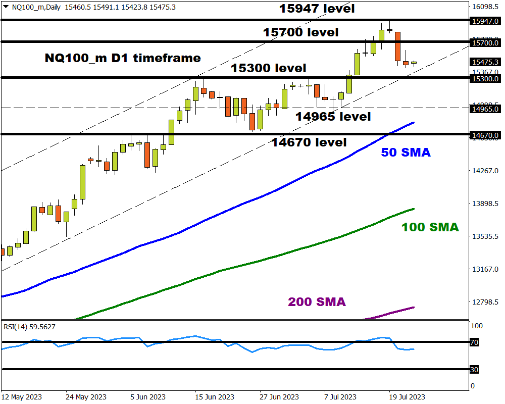 Earnings from the likes of Microsoft and Alphabet on Tuesday 25th, and Meta on Wednesday 26th will the under the spotlight. When factoring how these Tech companies are within the top 5 holdings and account for roughly 16% of the Nasdaq 100 Index, their results could influence the index. Ultimately, a positive set of earnings may stimulate risk appetite, propelling the NQ100_m higher. Should earnings disappoint, this could drag prices closer to the 15300 support level – resulting in a potential breakdown.