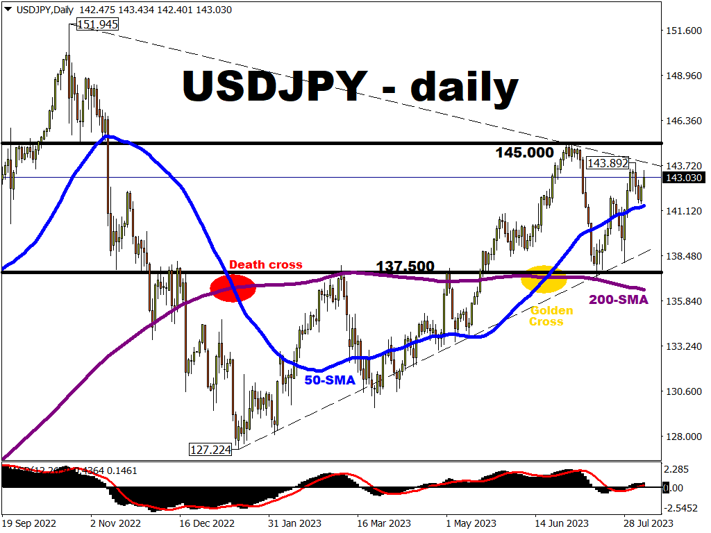 The sharp rise in long-dated Treasury yields has impacted USD/JPY which is hovering around 143 again.