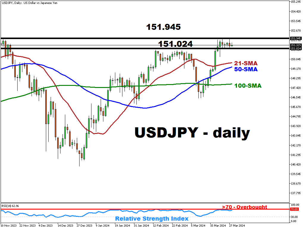 USDJPY is consolidating next to ~151.945 – 2024 high for the currency pair following the emergency meeting held by the Japanese monetary authorities.