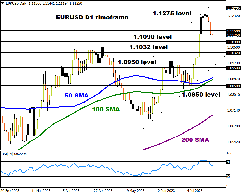 - A cautious-sounding ECB that signals a pause in hikes down the line could weaken the euro, pulling the EURUSD lower.