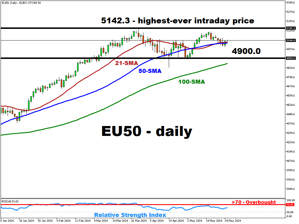 Since posting its highest-ever intraday price of 5142.3 in early April, the EU50 has been stuck between the 4900 – 5100 range, with prices forming a double top.