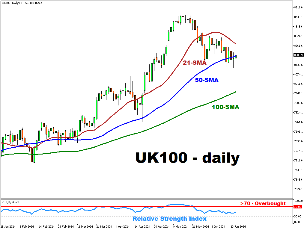 If the BOE signals that it can begin easing rates by then, that could weaken GBP while boosting UK100 back towards the 8300 mark.
