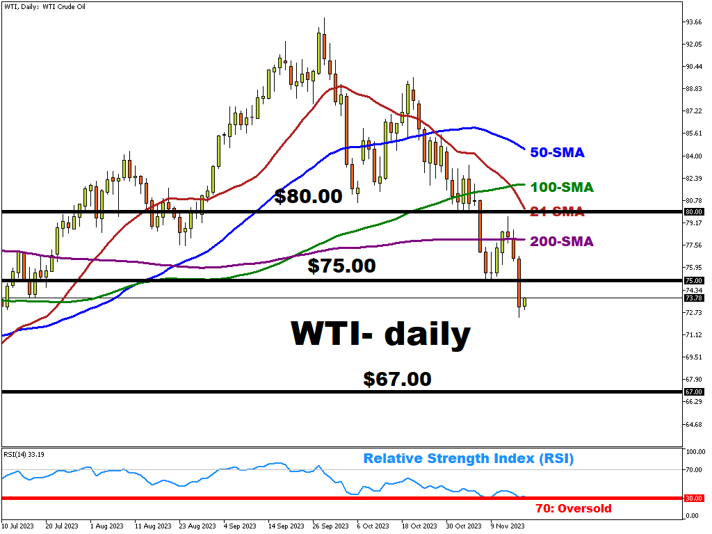 However, with WTI Crude currently trading way below all the major simple moving averages (SMAs), including the 200-period SMA at 77.956, may signal a strong downward trend.