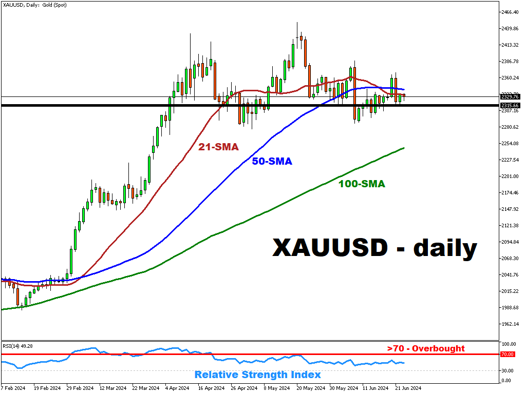 The XAUUSD is currently trading below its 21 and 50 SMAs, but above its 100 SMA, indicating a bullish long-term trend, while signaling a negative short-term trend.