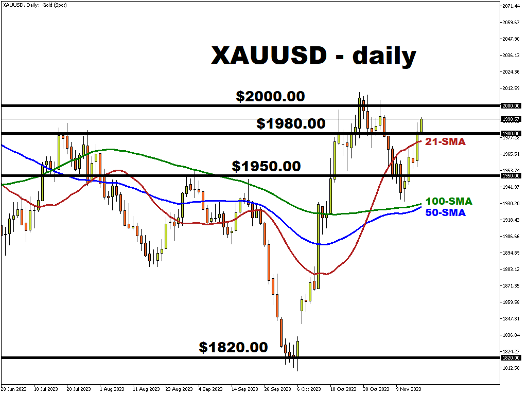 Gold prices have strongly rebounded up to ~$1986 after dropping below the $1950 round number last week.